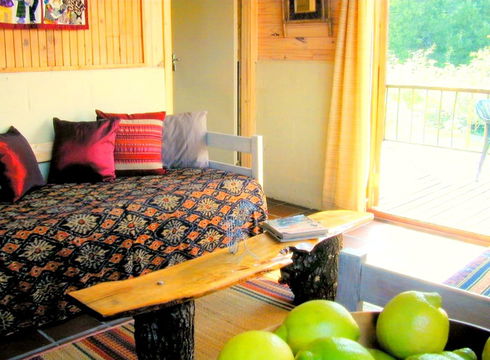 OFFERS: A double bedroom with painted cement floor, a bathroom with shower, and a kitchen galley with all you need for a comfy stay. An open-plan lounge with fireplace, quarry tiled floors (with a small sleeper couch for a child).